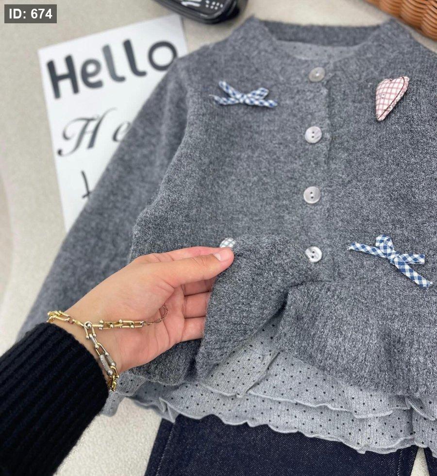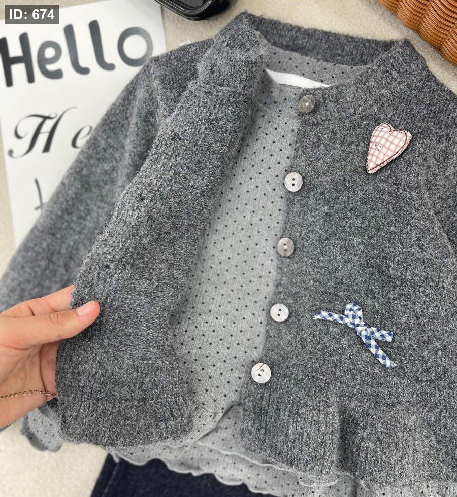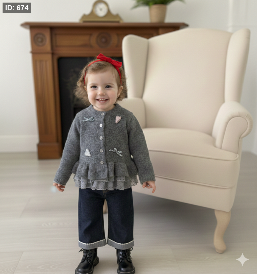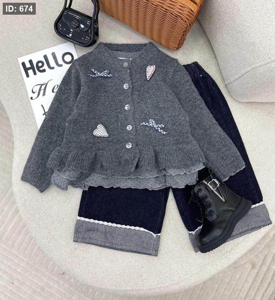 طقم بناتي ثلاث قطع جينز عريض وجكيت صوف وبلوز