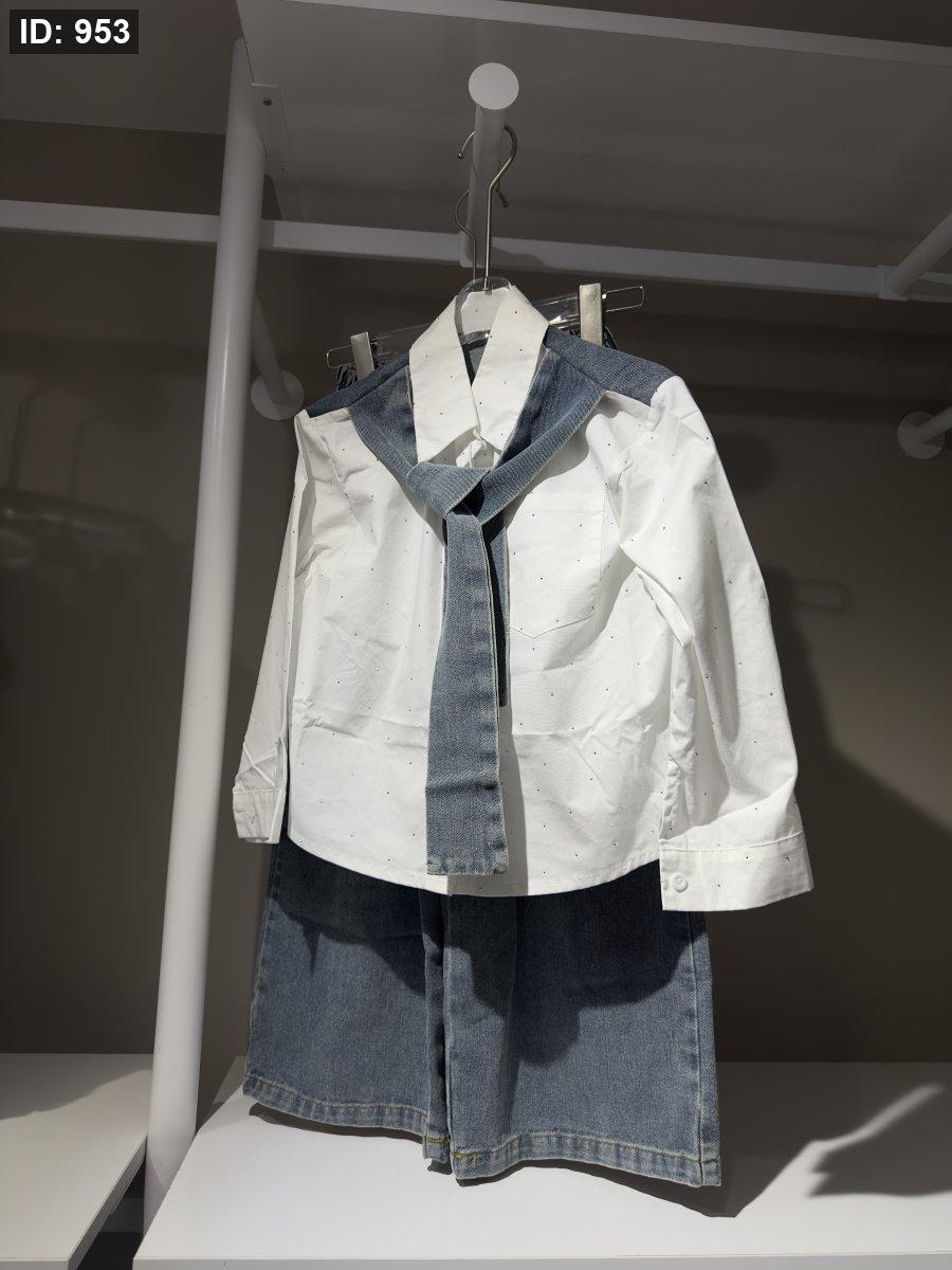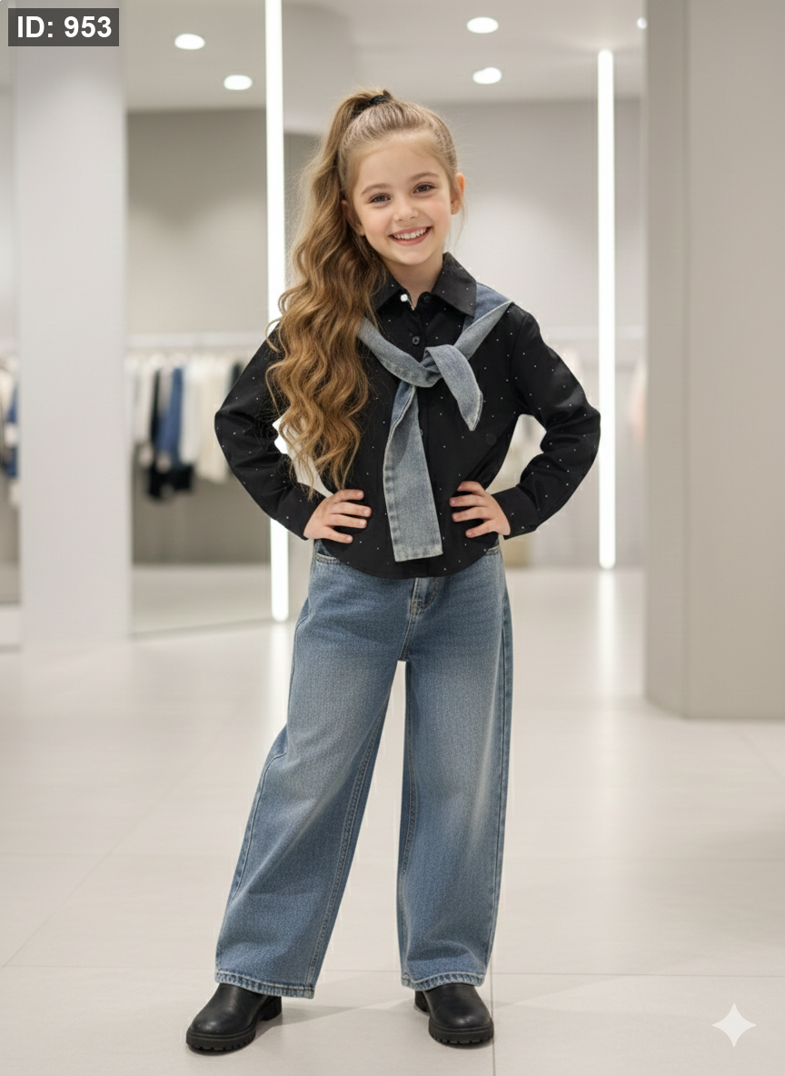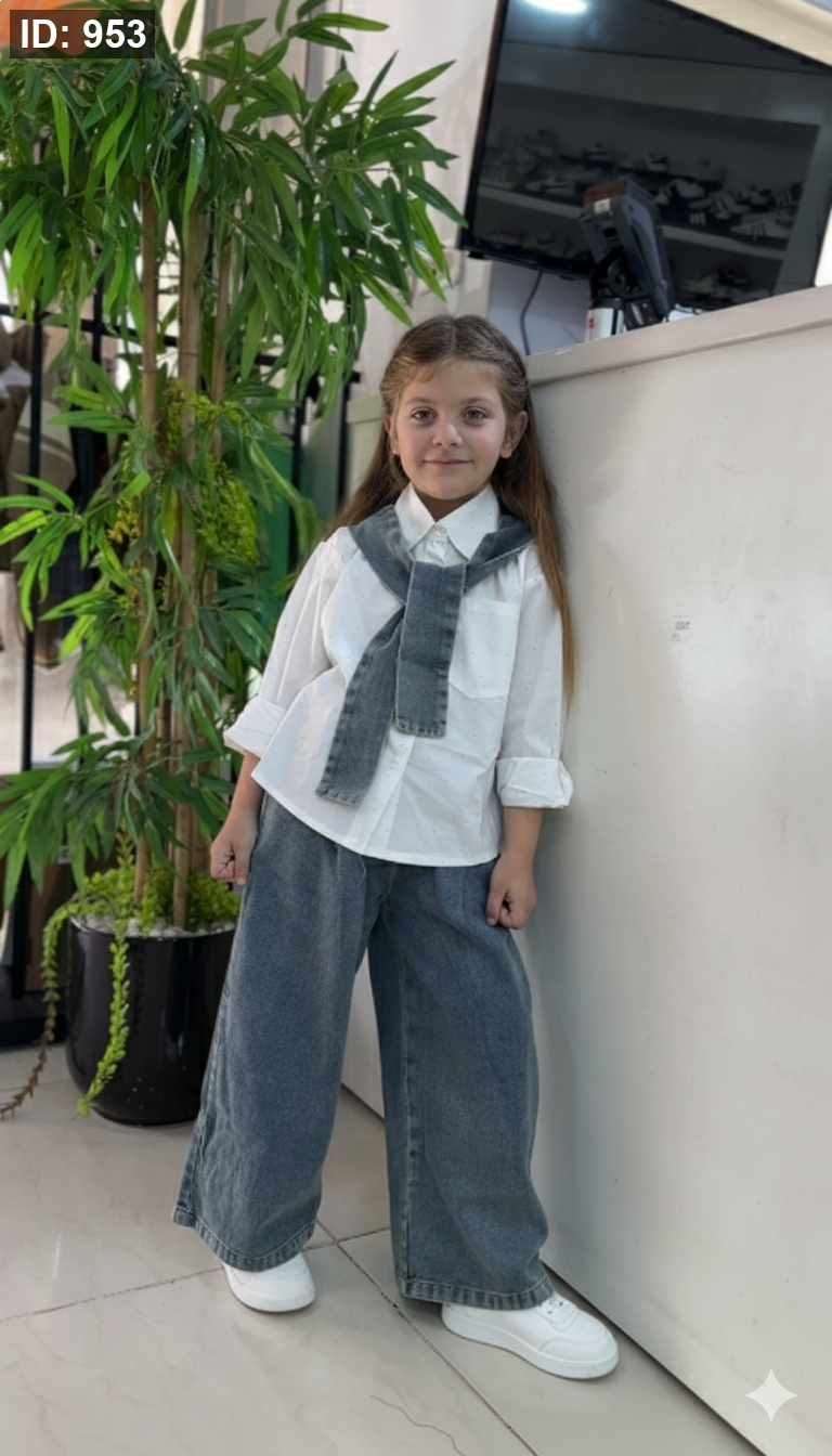 طقم بناتي انيق قميص كلو سترس مع سكارف جينز وبنطلون جينز عريض